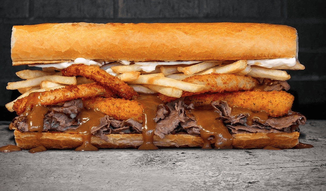 Thinly Sliced Ribeye Steak, Mozzarella Sticks, Onion Rings, Fries, Brown Gravy, Mayo, on a garlic hero