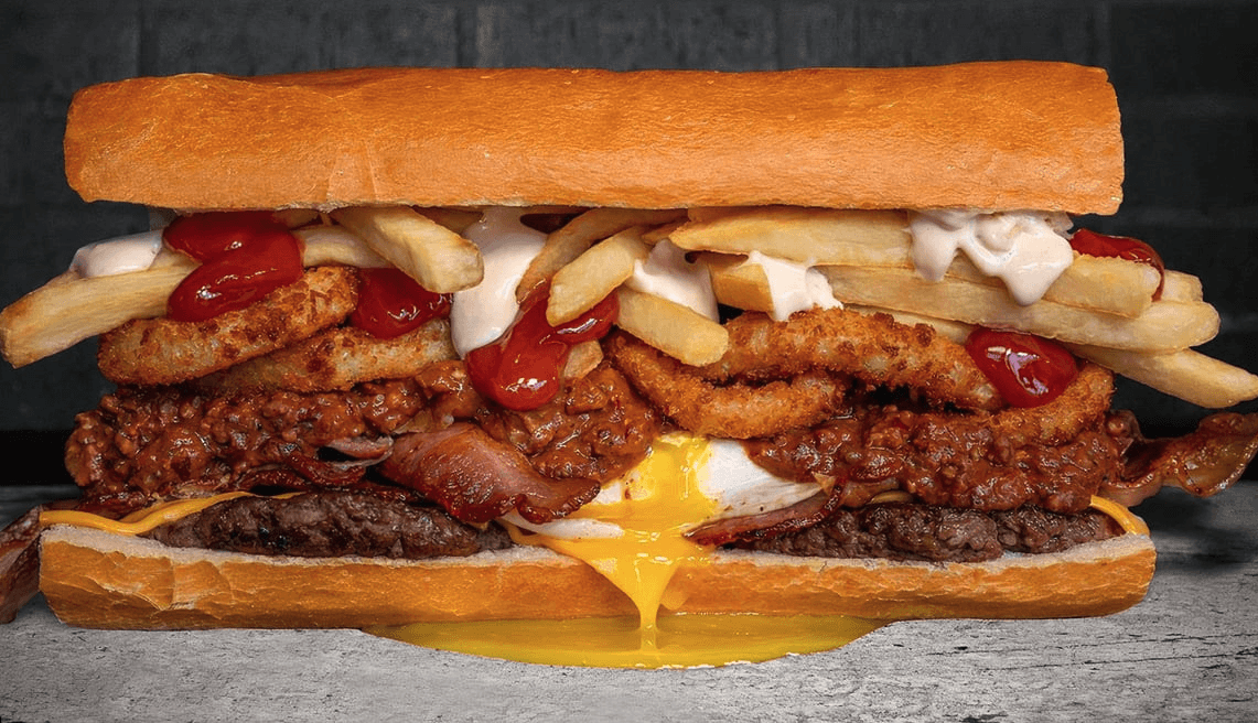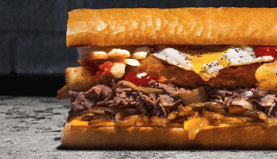 Fried Eggs,, Ham, Crisp Bacon, Breakfast Sausage, Mozzarella Sticks, Melted American, Tots, Ketup, Tapatio, on a butter grilled hero