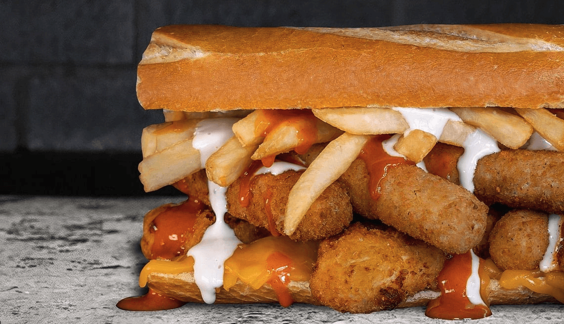 Chicken Fingers, Mozzarella Sticks, Melted Cheddar, Fries, Buffalo Hot Sauce, Blue Cheese dressing, on a hero