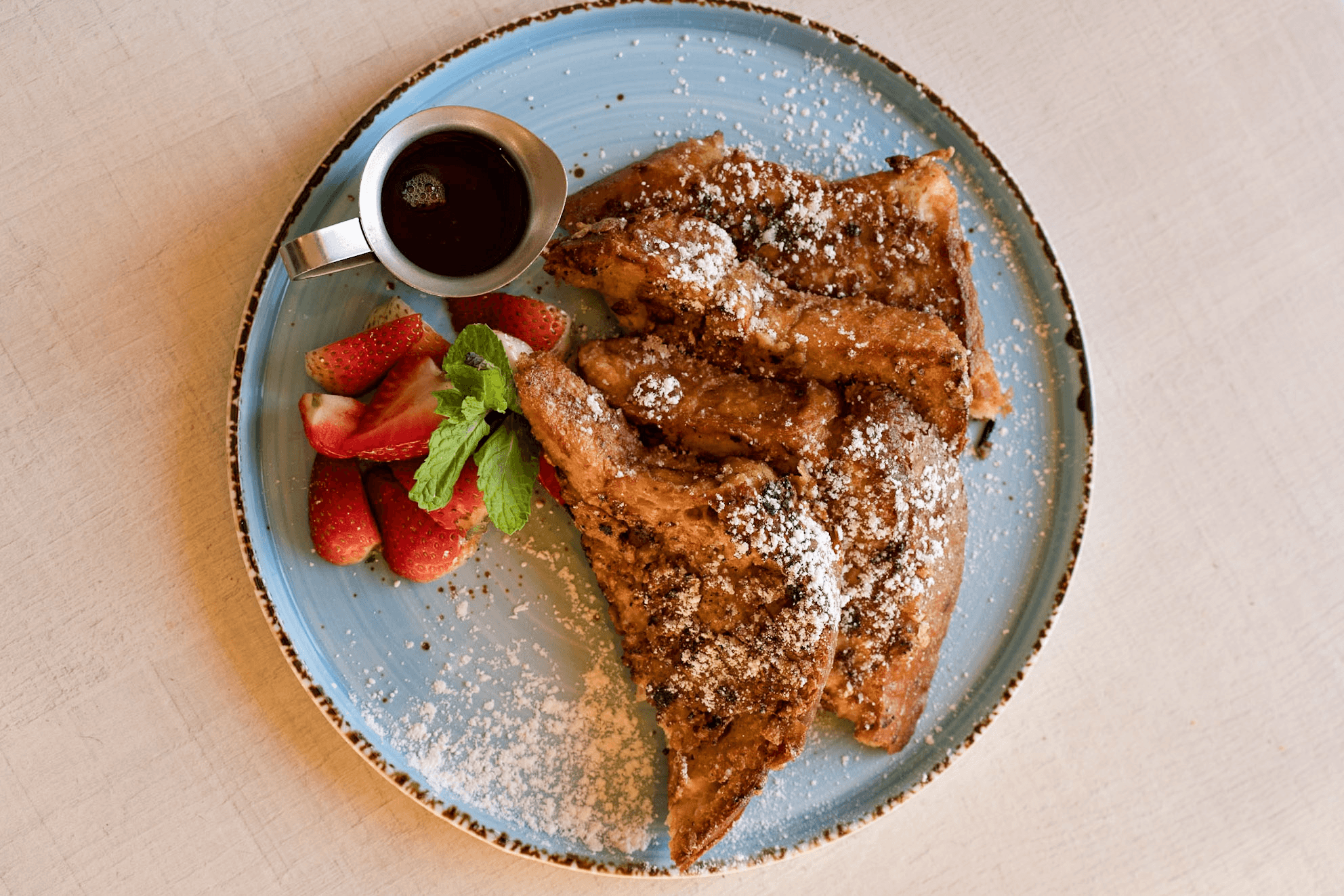 Bacon & Ham, leeks, onions, served with salad and Fruits