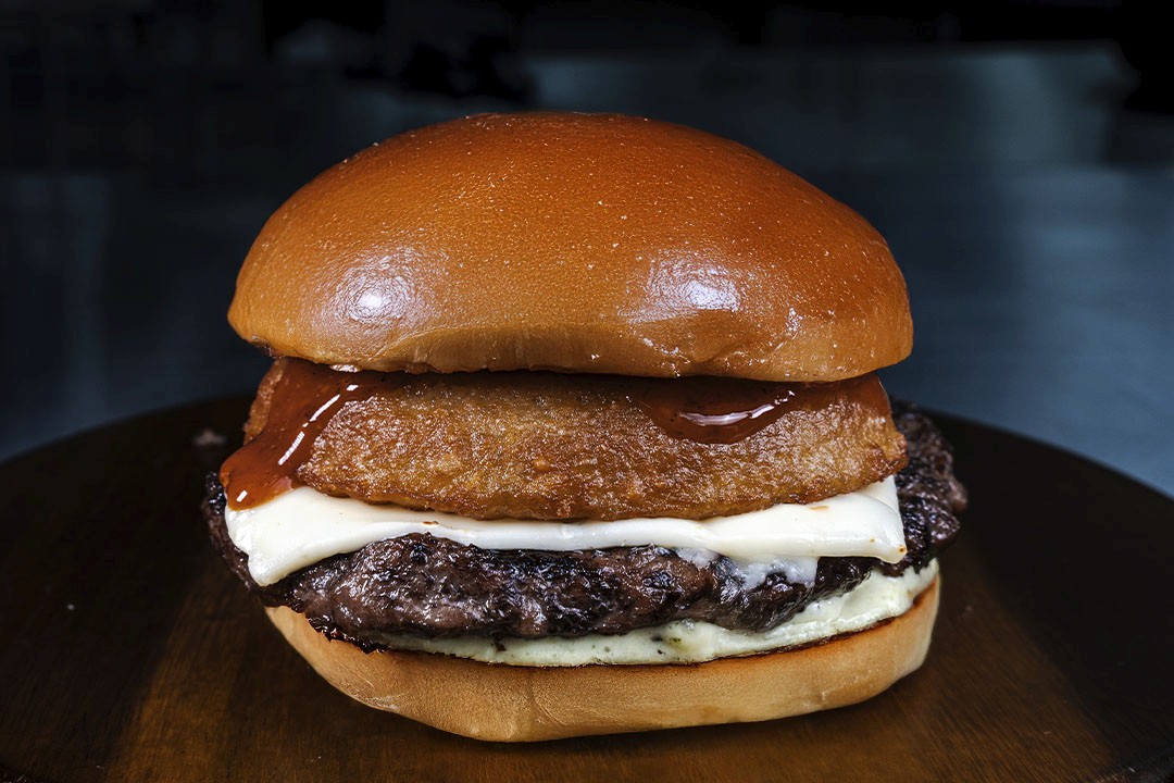 5oz Black Angus Patty, Swiss Cheese, Applewood Smoked Bacon, Onion Ring, & House Made Chipotle Dressing on Brioche Bun