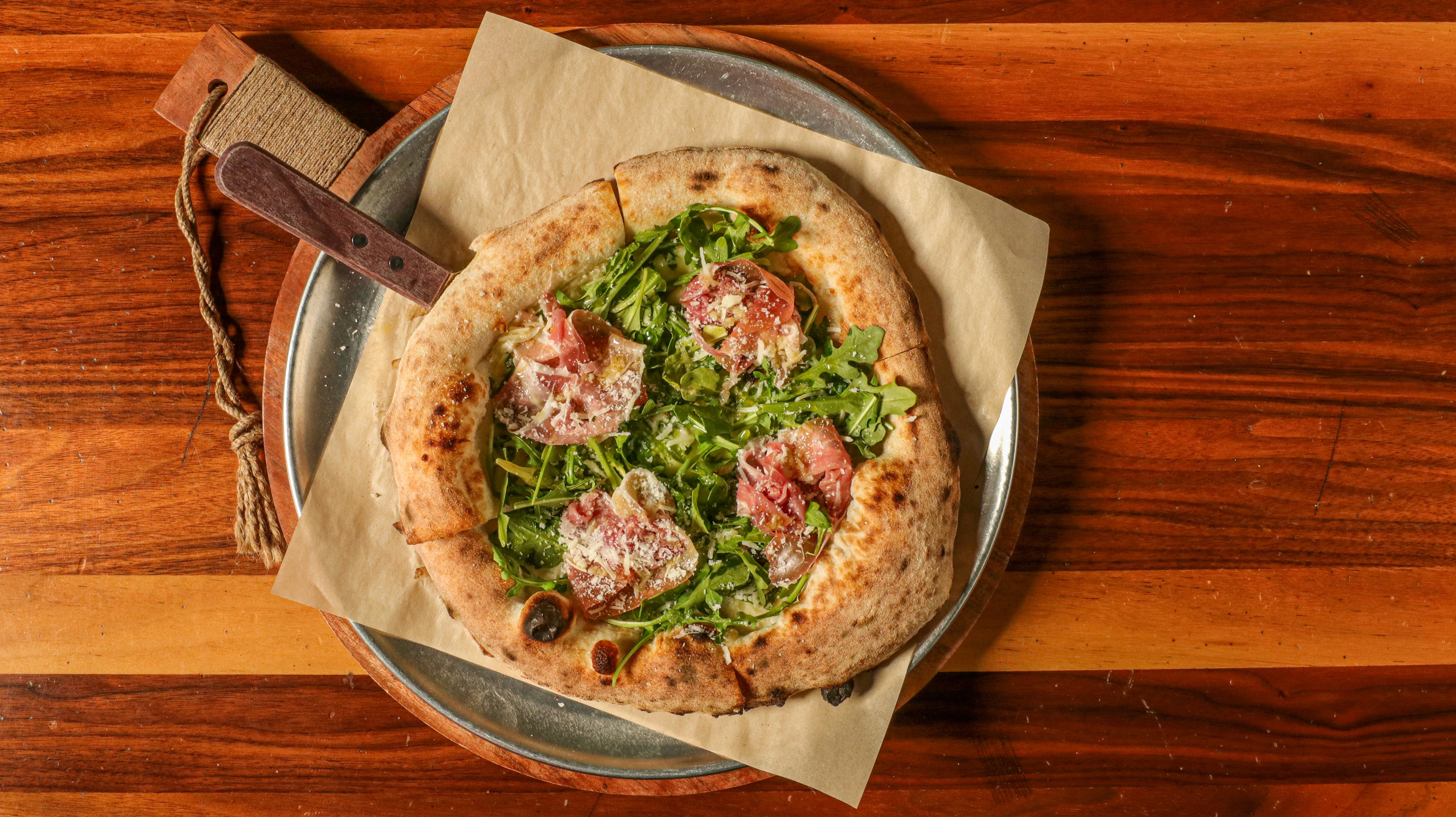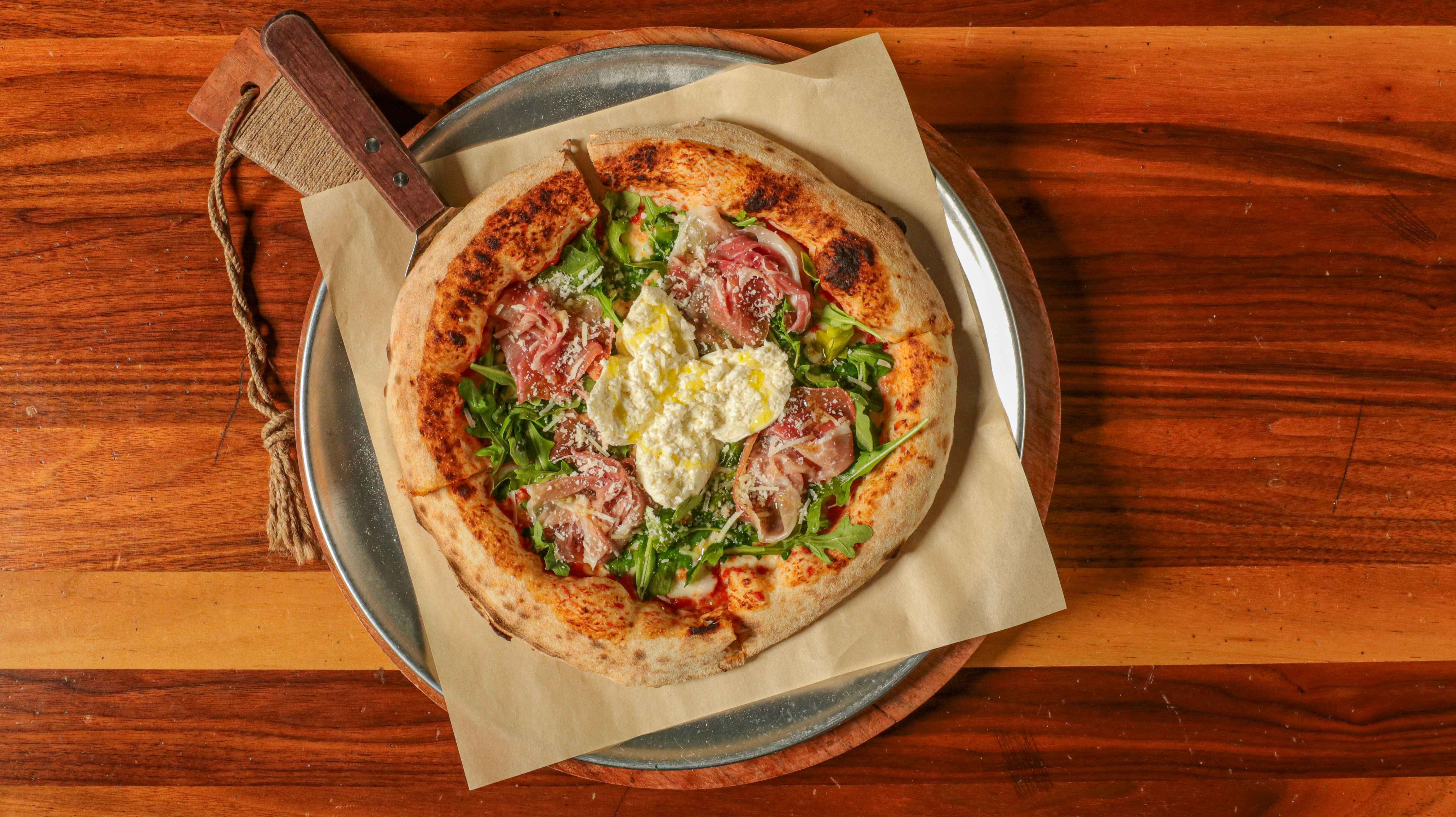 Ground tomato, garlic, sea salt, mozzarella, arugula, prosciutto, burrata, Pecorino Romano, olive oil