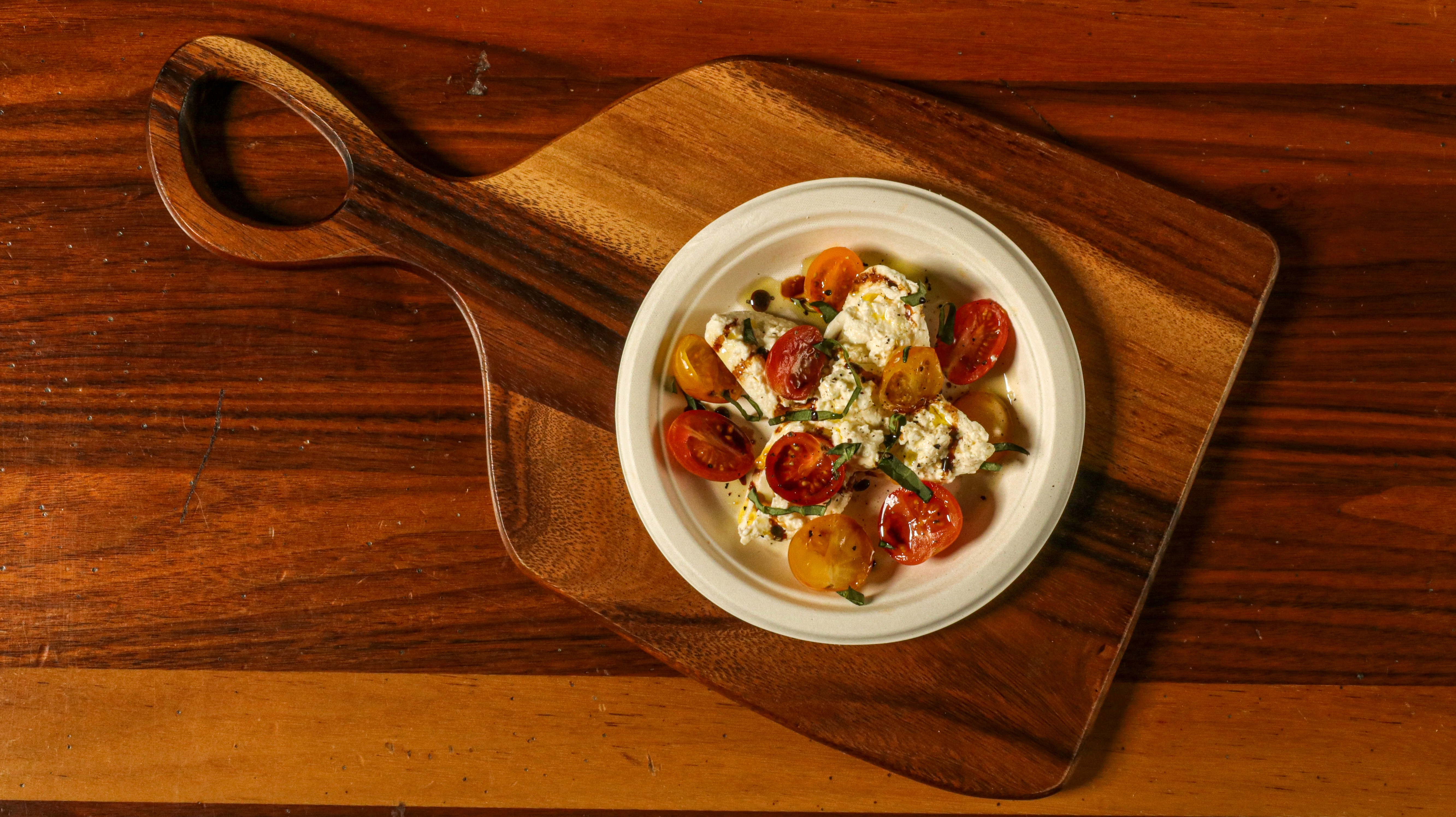 EVOO, mozzarella, cherry tomato, garlic, basil, sea salt, Parmigiana Reggiano