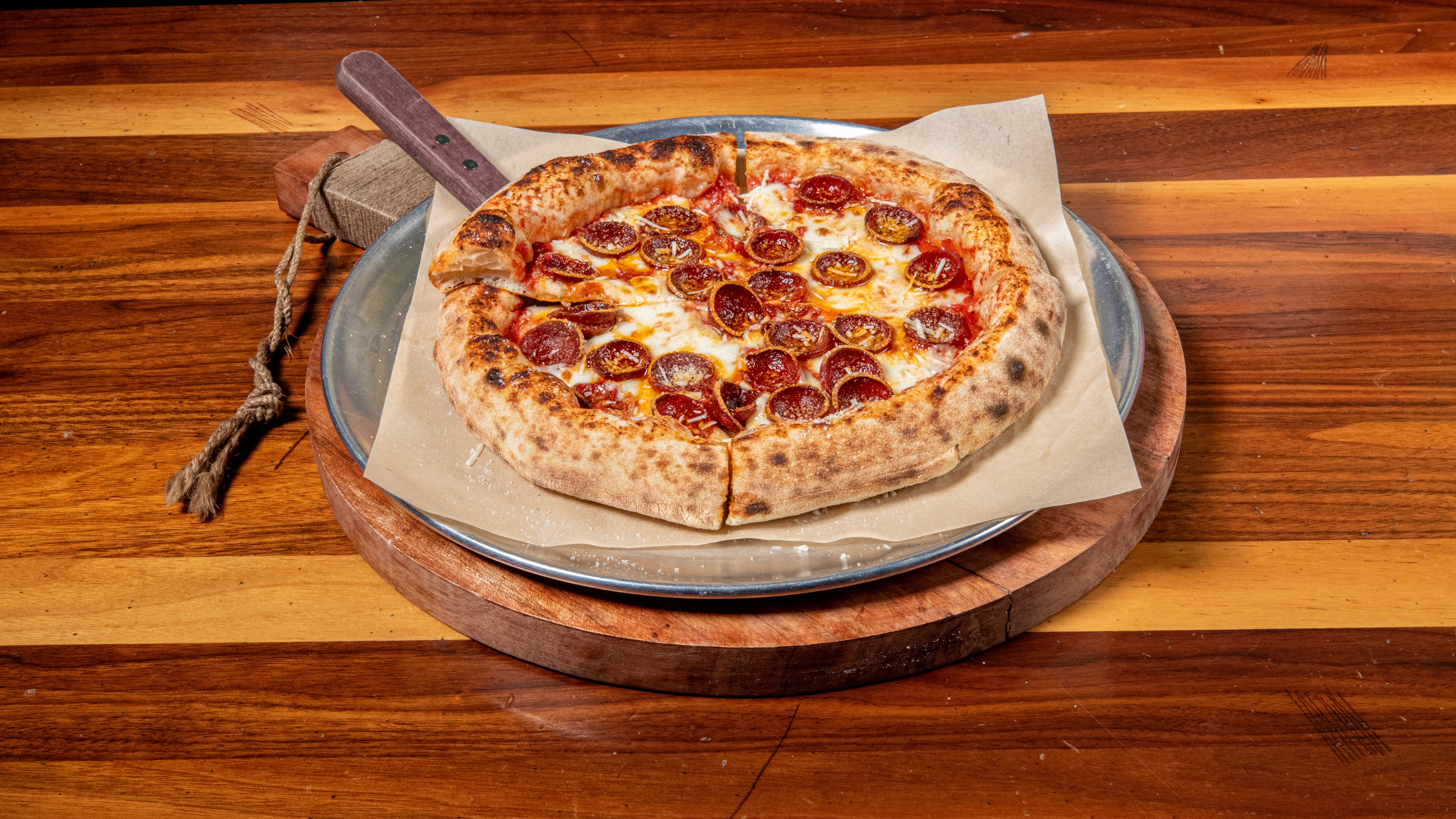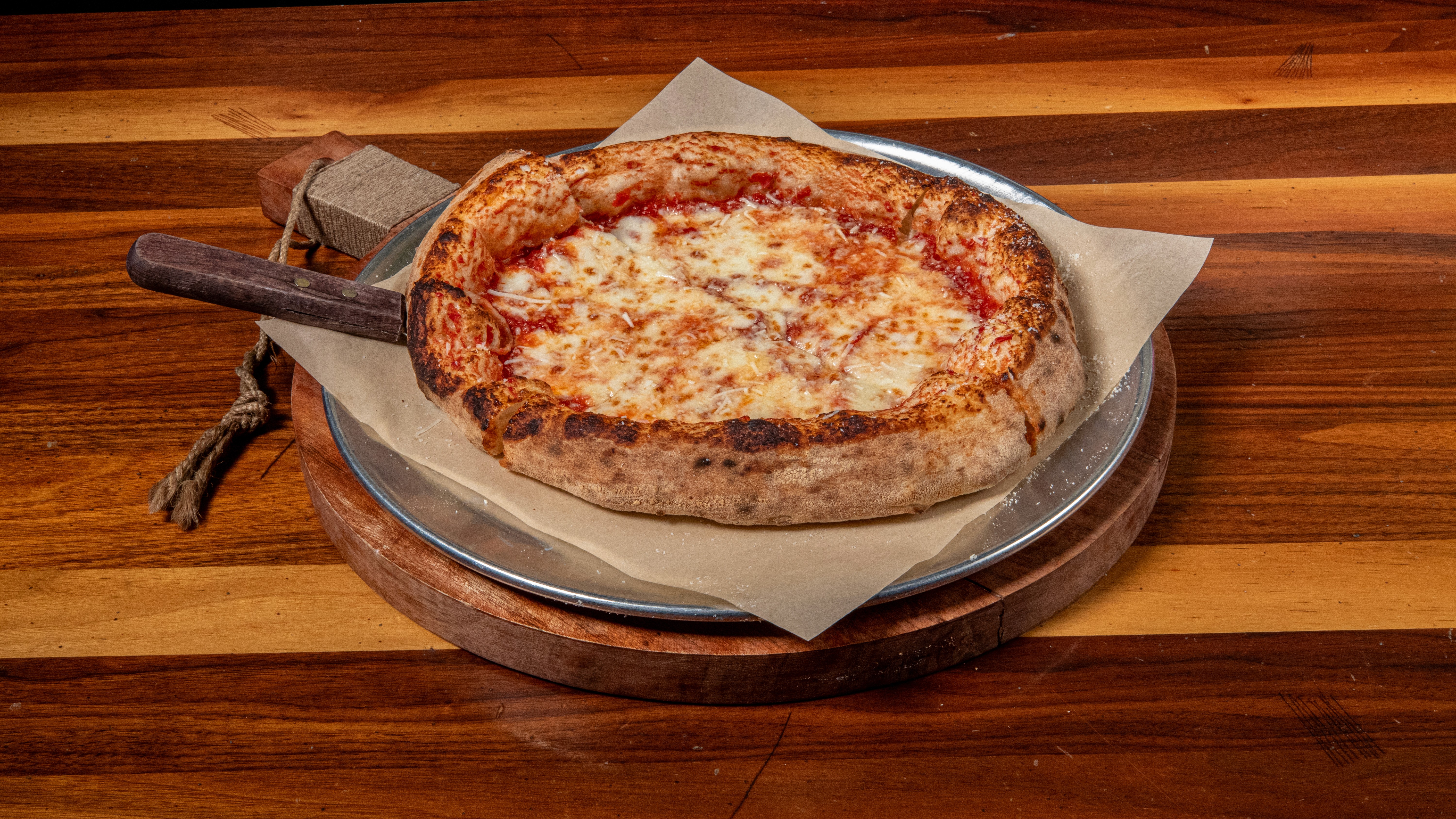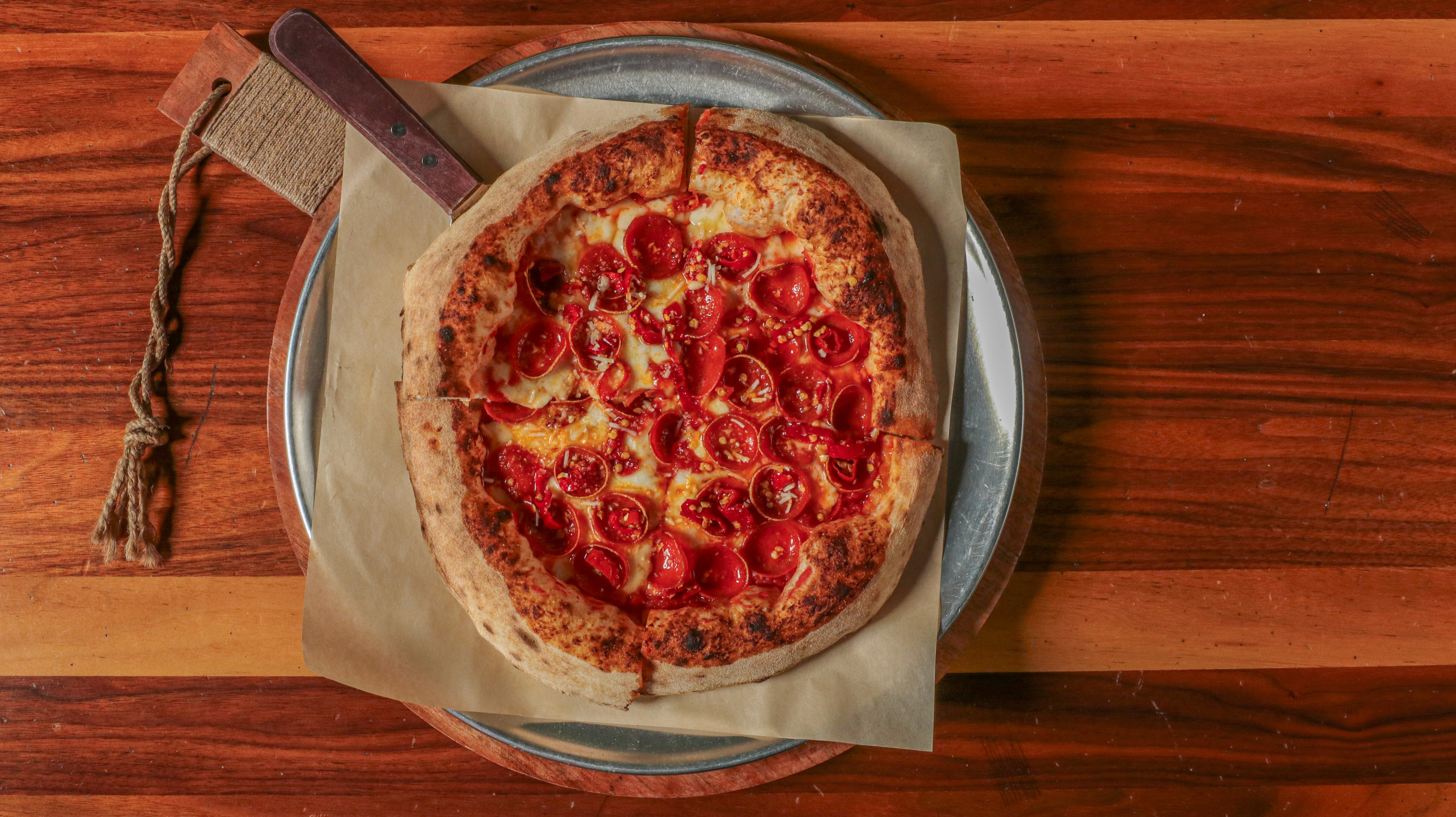 Ground tomato, mozzarella, old world pepperoni, Pecorino Romano, sea salt