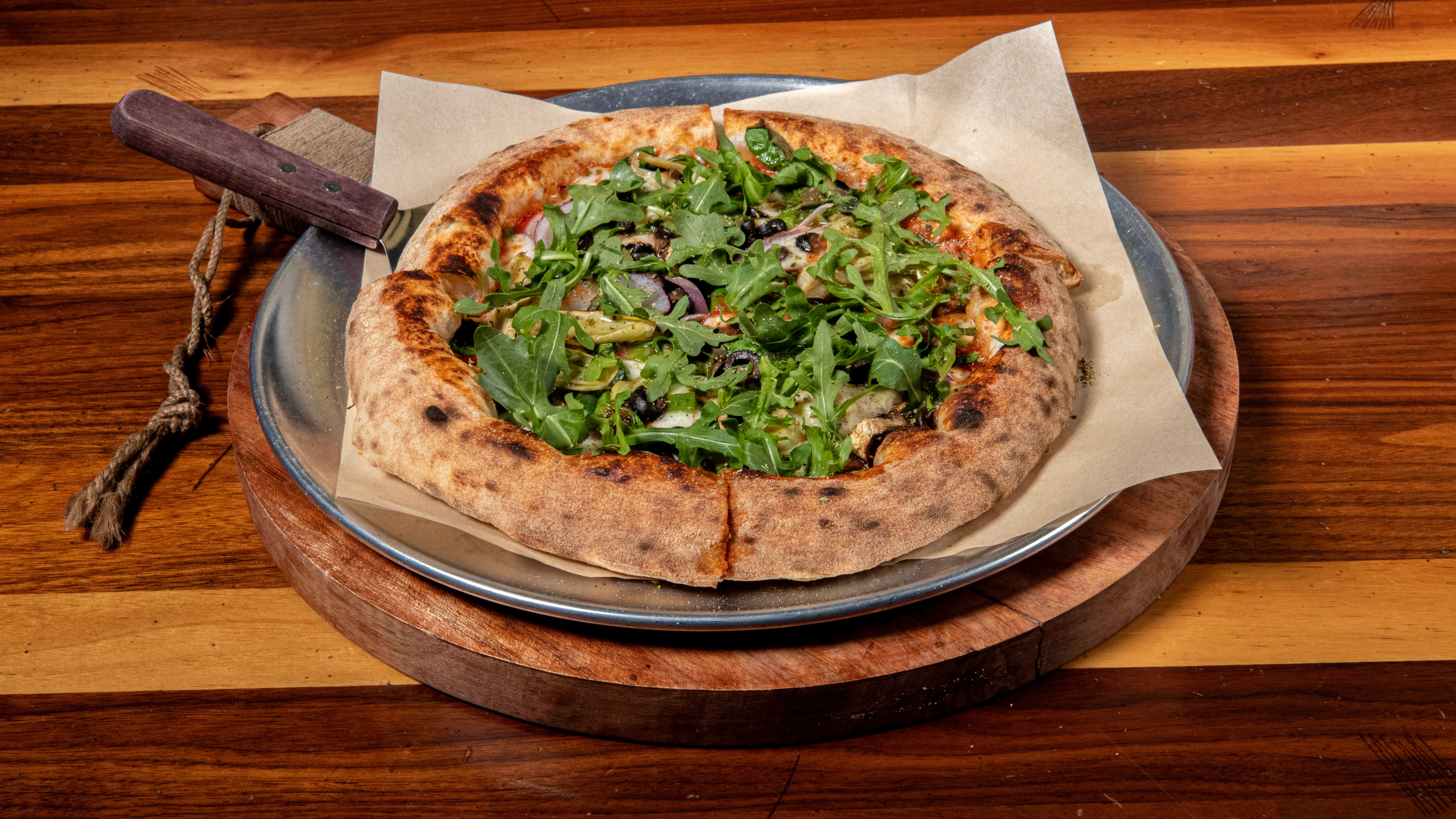 Ground tomatoes, garlic, sea salt, mozzarella, bell pepper, artichoke, mushroom, onion, olive, spinach, arugula, Parmigiana Reggiano, oregano