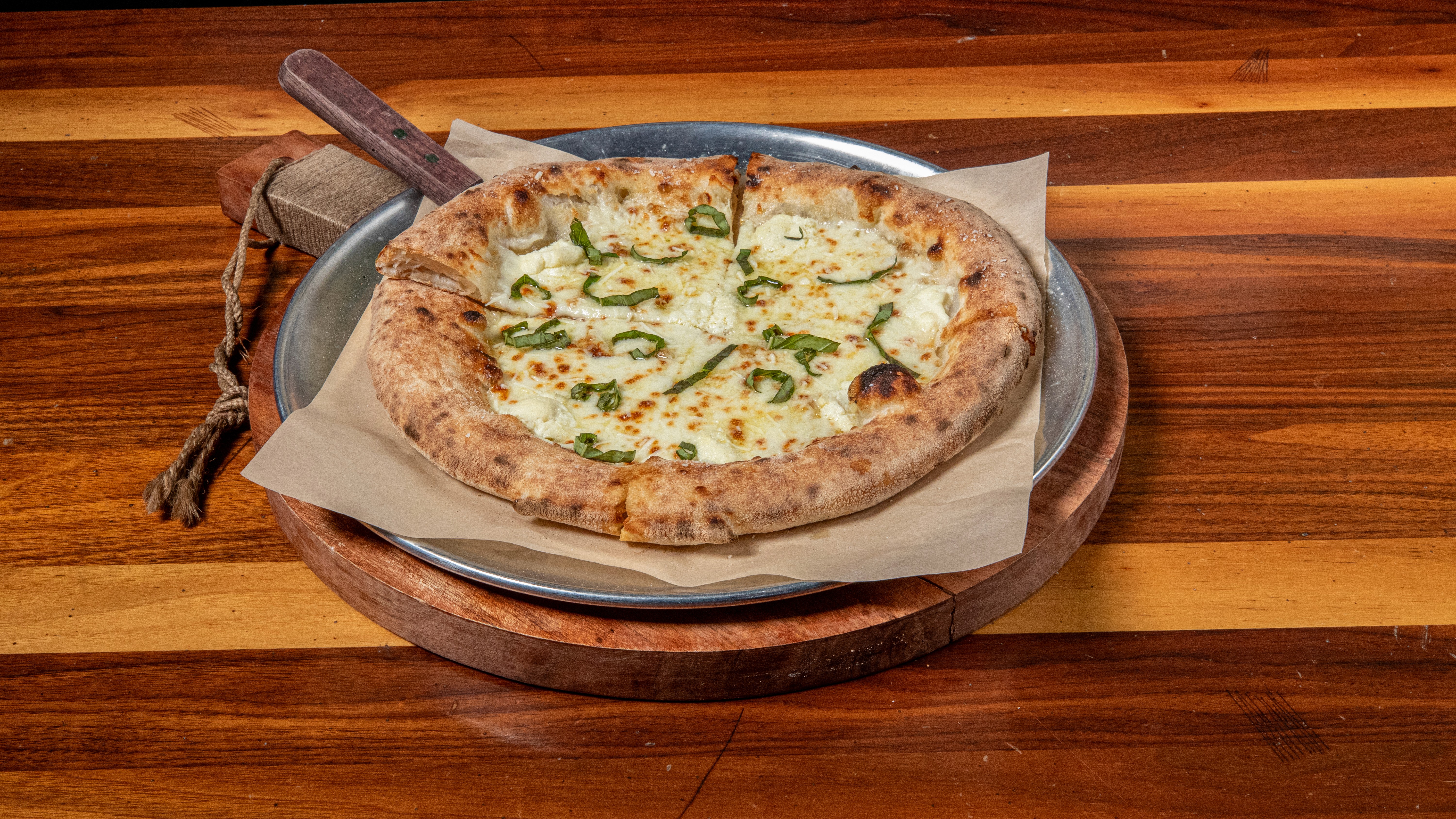Pesto, garlic, sea salt, mozzarella, honey whipped ricotta, sausage, basil, Pecorino Romano