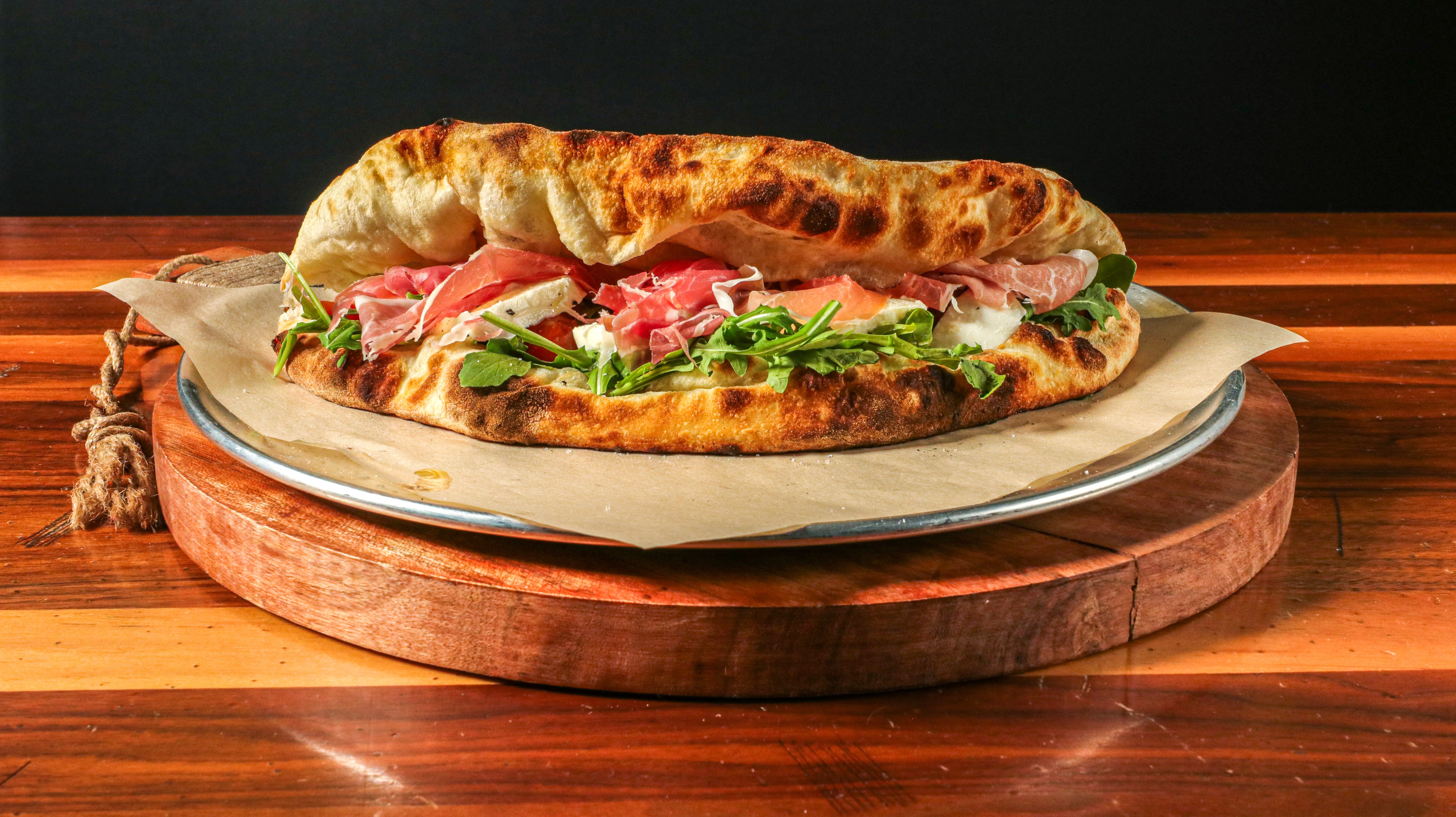 Folded pizza dough sandwich with: Prosciutto, mozzarella, arugula, heirloom tomatoes, truffle oil, salt and pepper