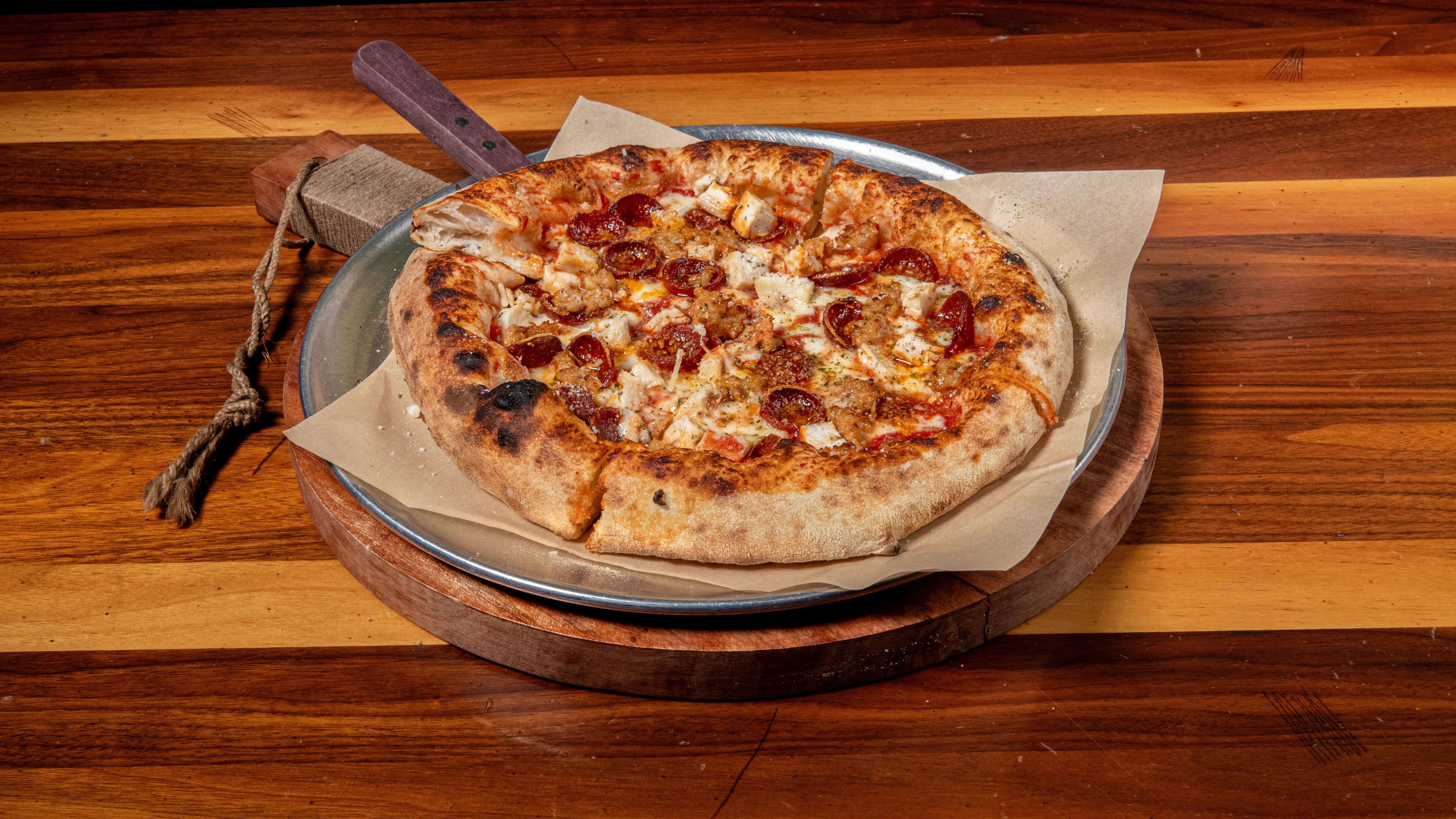 Ground tomatoes, sea salt, garlic, mozzarella, pepperoni, sausage, chicken, Parmigiana Reggiano, oregano