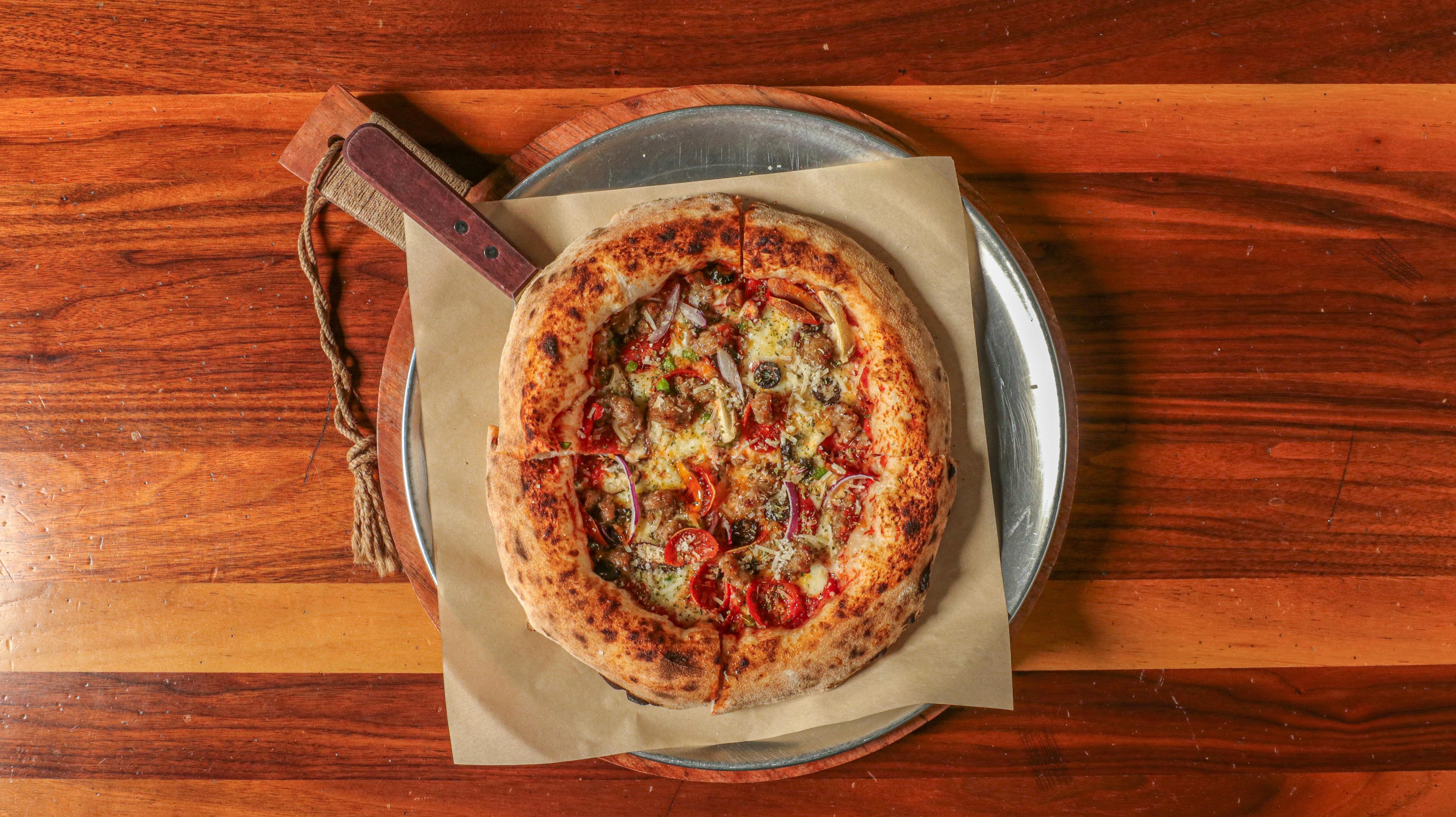 Ground tomatoes, sea salt, garlic, mozzarella, pepperoni, sausage, bell pepper, mushroom, onion, olive, Parmigiana Reggiano, oregano