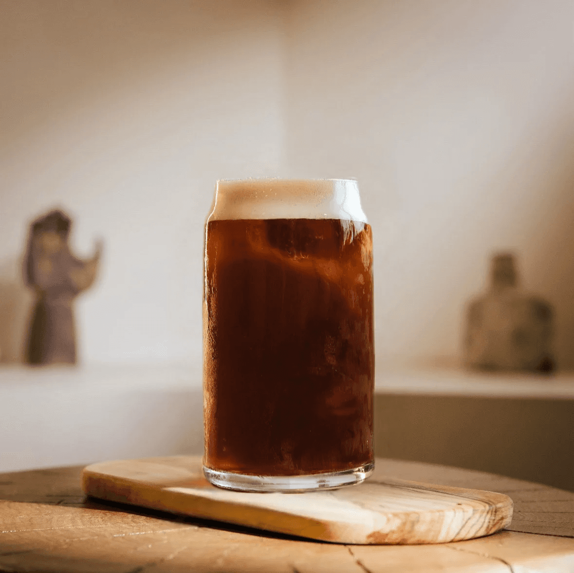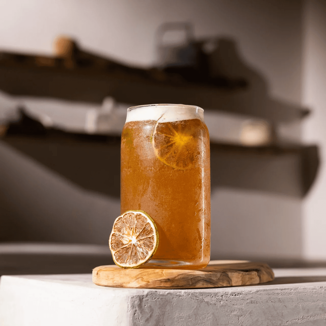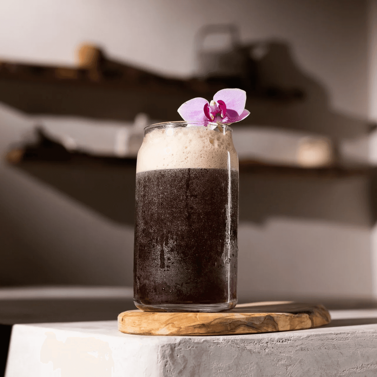 A soothing blend of our lightly roasted barley tea and dark roasted oolong tea, creating a gentle smoky flavor that evokes the comforting glow of embers. This is perfect for those who are more sensitive to caffeine as the tea base is mainly composed of our non caffeinated roasted barley tea and JUST a little hint of the dark roast oolong tea. This drink pairs perfectly with the house made made Roasted Barley Jelly.