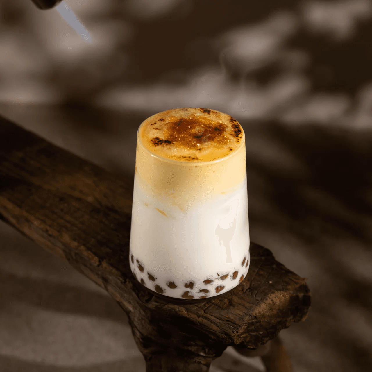 Starting from the bottom, you have our house made Brown Sugar Tapioca Mochi nestled in the creamy & chilled home-made milk base, then here it comes, the drink is capped with a layer of our freshly toasted crème brûlée cloud, adding a caramelized layer of indulgence to this cup of delight. Served as crafted.
