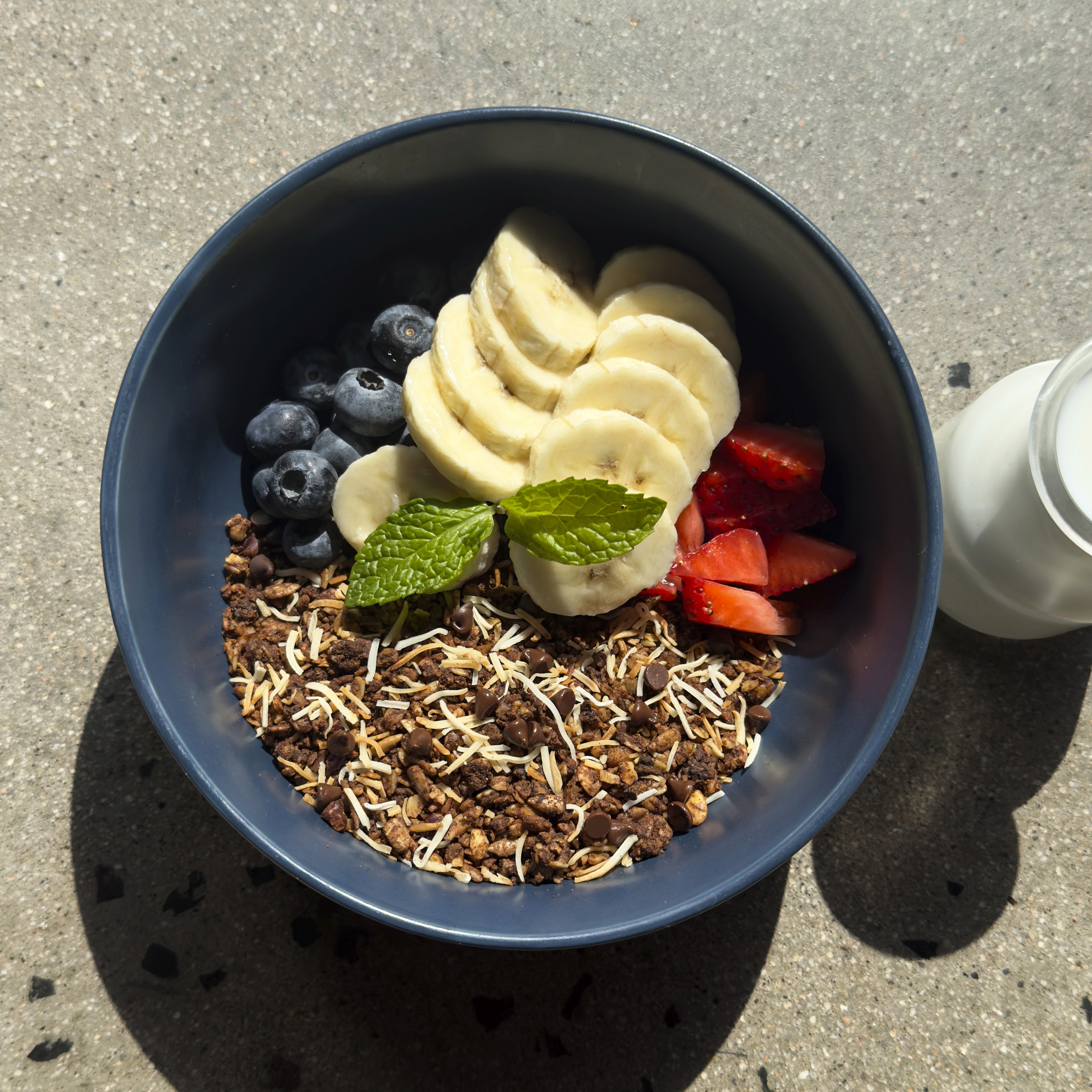 Housemade granola, chocolate nibs, berry medley, and a side of milk